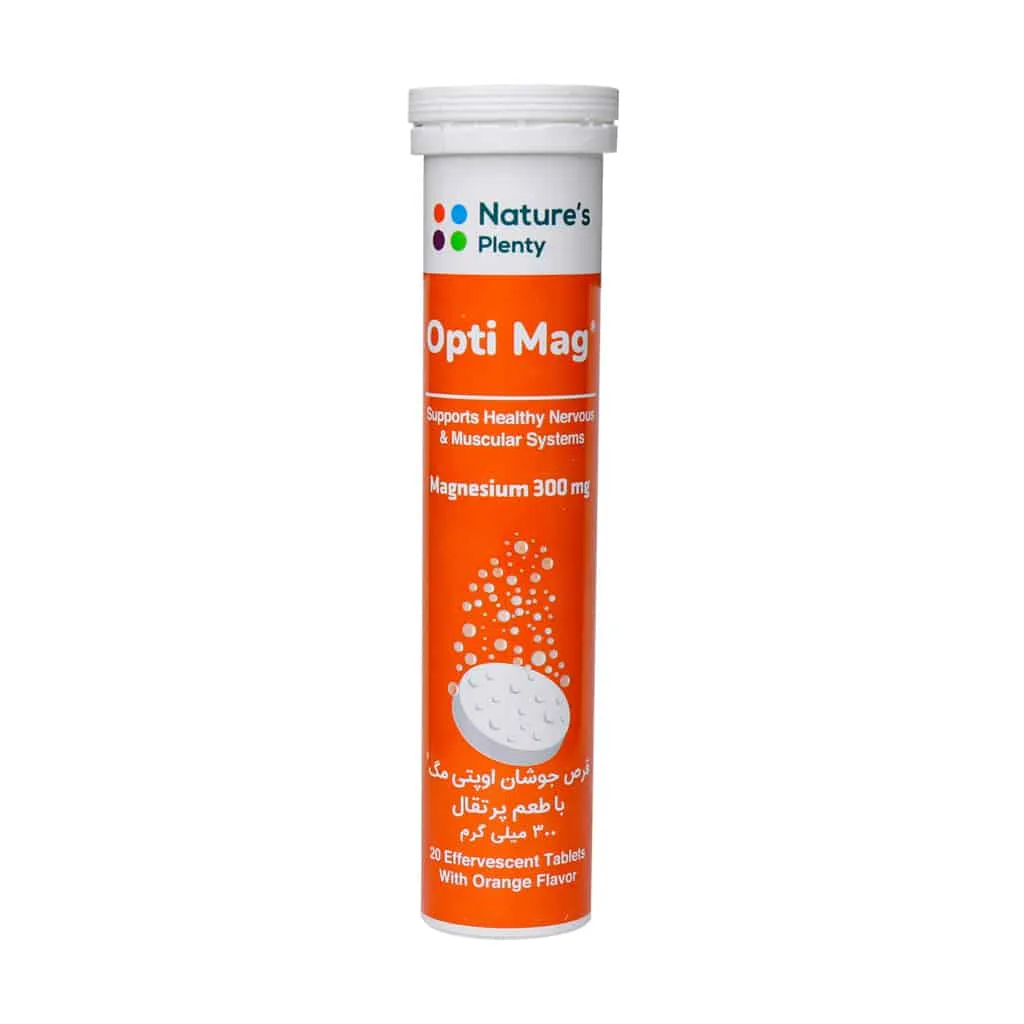 قرص جوشان اوپتی مگ نیچرز پلنتی محصولی از شرکت افق تدبیر سلامت است. هر قرص از این مکمل حاوی 300 میلی گرم منیزیم به فرم اکساید است و در مواردی همچون تامین منیزیم روزانه بدن، کمک به سلامت و بهبود عملکرد سیستم عصبی عضلانی و کاهش گرفتگیهای عضلانی، حفظ تراکم استخوان و کاهش ضعف و خستگی کاربرد دارد.